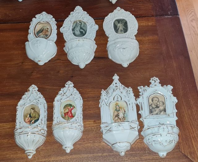 Collezione di 7 antiche acquasantiere in porcellana con una stampa al centro. Prezzo negoziabile.