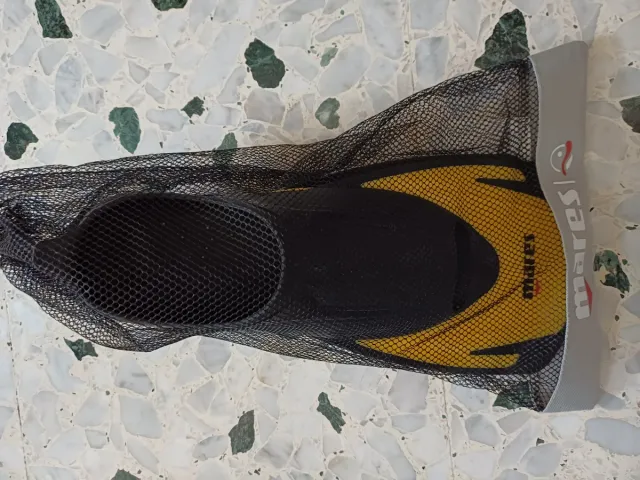 Pinne da nuoto Mares in rete. - Colore giallo e nero. - Logo Mares visibile.