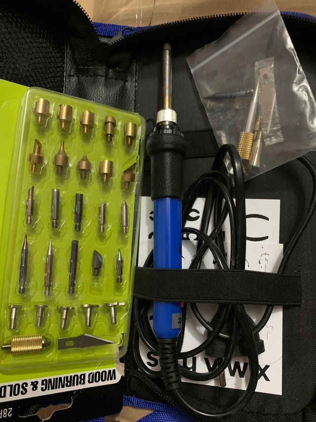 Pirografo con custodia e pacco di punte decorative Usato poche volte (2 punte nella bustina sono piegate ma comunque usabili)