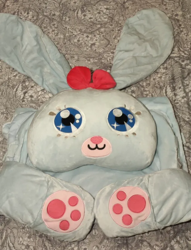 Dettagli del prodottoMorbido pisolone a forma di coniglio, perfetto per i più piccoli. Realizzato in peluche azzurro, è dotato di grandi orecchie e un simpatico fiocco rosso.