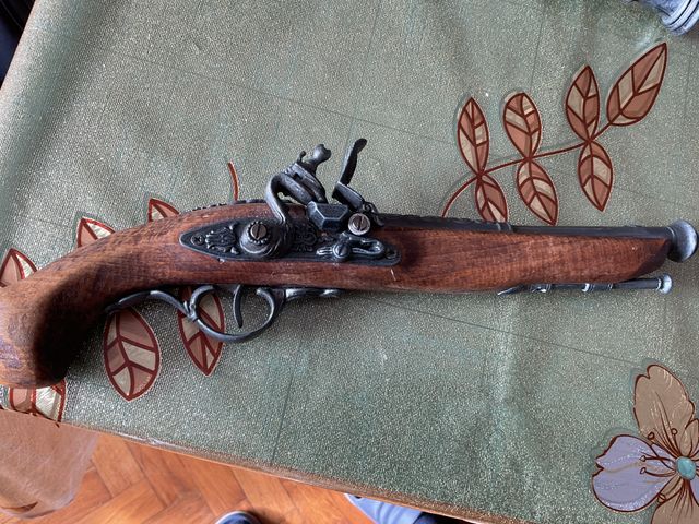 Dettagli del prodottoReplica di pistola antica in stile flintlock, con finiture decorative.
