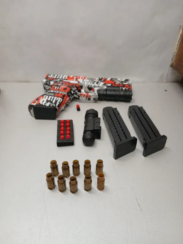 Pistola giocattolo con design a tema graffiti. - Include caricatore. - Include mirino laser. - Include proiettili in gel. - Include caricatore aggiuntivo.