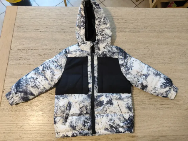 Caldo piumino per bambino/a, taglia 5 anni, con una particolare fantasia. - Fantasia astratta bianco e nero. - Cappuccio integrato. - Chiusura frontale con zip.