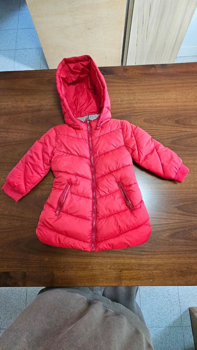 Caldo piumino rosso per bambina, taglia 2 anni. - Cappuccio integrato. - Chiusura con zip frontale. - Tasche laterali con zip.