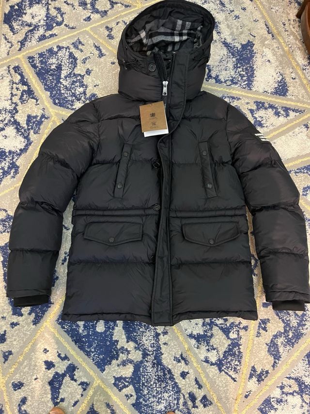 Dettagli del prodottoElegante piumino nero Burberry con cappuccio, perfetto per le giornate più fredde. Presenta un design trapuntato e tasche frontali.