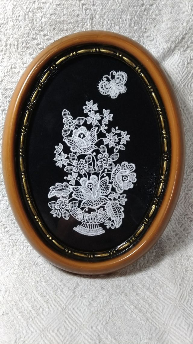 quadretto ovale cm. 20 x cm. 15 in pizzo di Cantù con motivo floreale e farfalla.