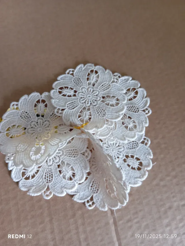 Dettagli del prodottoDelicato pizzo rotondo di colore beige, perfetto per decorazioni o progetti creativi di cucito, artigianato.