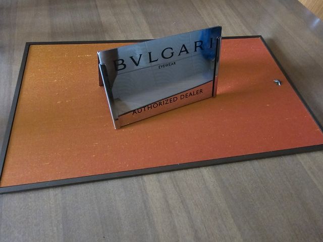 Dettagli del prodottoElegante placca Bvlgari in acciaio specchiato con relativo vassoio espositore per occhiali da banco con stemma di casa Bvulgari.