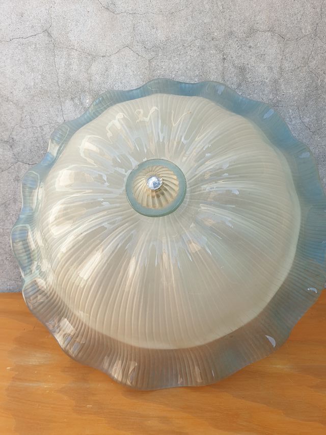 Dettagli del prodottoGrande plafoniera in vetro a forma di fiore Può essere utilizzata come luce a parete o a soffitto. Struttura in metallo smaltato e paralume in vetro con incisioni radiali e bordo acquamarina. Un piccolo bottone di vetro tiene unito il diffusore alla struttura.Impianto elettrico controllato,ricablato e pronto all'uso