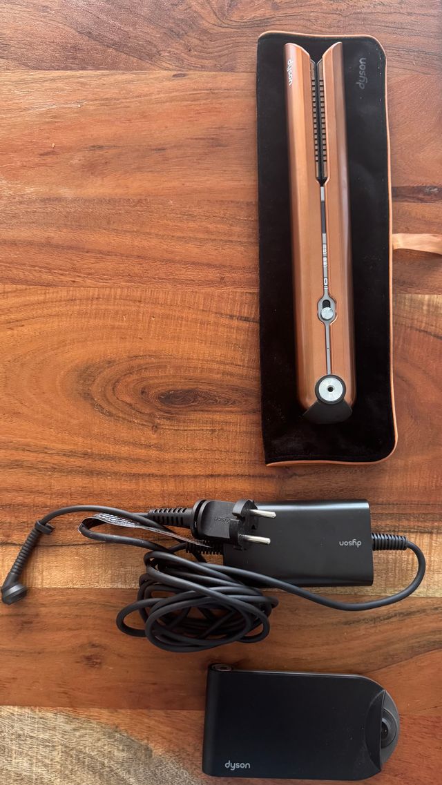 Dettagli del prodottoPiastra per capelli Dyson Corrale color rame. Include custodia protettiva e caricabatterie; wireless e con cavo.