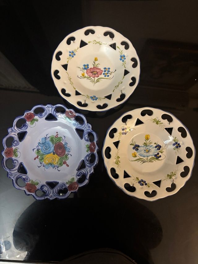 Dettagli del prodottoSet di tre piatti decorativi antichi di Siol Portugal. Ogni piatto presenta un disegno floreale dipinto a mano e un bordo traforato.