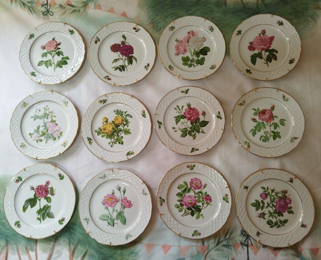 Elegante collezione limitata di 12 piatti in porcellana - ceramica fine con finiture dorate: Le classiche rose di Pierre - Joseph Redouté, da appendere alla parete della cucina o sopra un mobile con supporti