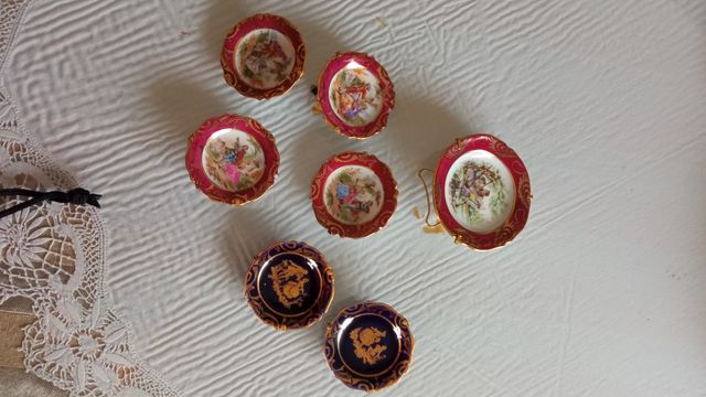 Dettagli del prodotto7 piccoli piatti in miniatura di Limoges, francesi, due blu e cinque rossi e bianchi, uno più grande, completi di supporto originale, bordi bordeaux intenso con rose dorate. Le scene e i bordi blu cobalto sono dorati. Il tutto con diverse scene romantiche. Uno di quelli rossi piccoli ha una tacca sul bordo. Da collezione. Prezzo unitario, se ne vuoi diversi faccio delle confezioni e riduco il prezzo La descrizione è stata tradotta automaticamente.