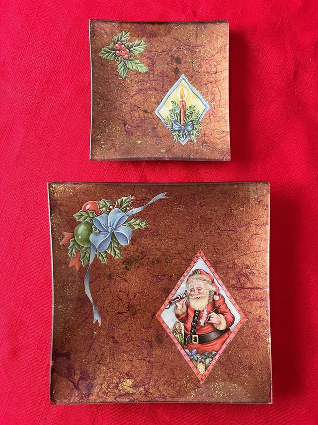 Dettagli del prodottoSet di due piatti decorativi con motivi natalizi. Design con foglie di agrifoglio e bacche rosse. Uno dei piatti include una candela accesa. L'altro piatto presenta una figura di Babbo Natale. Finitura con texture e dettagli dorati. La descrizione è stata tradotta automaticamente.
