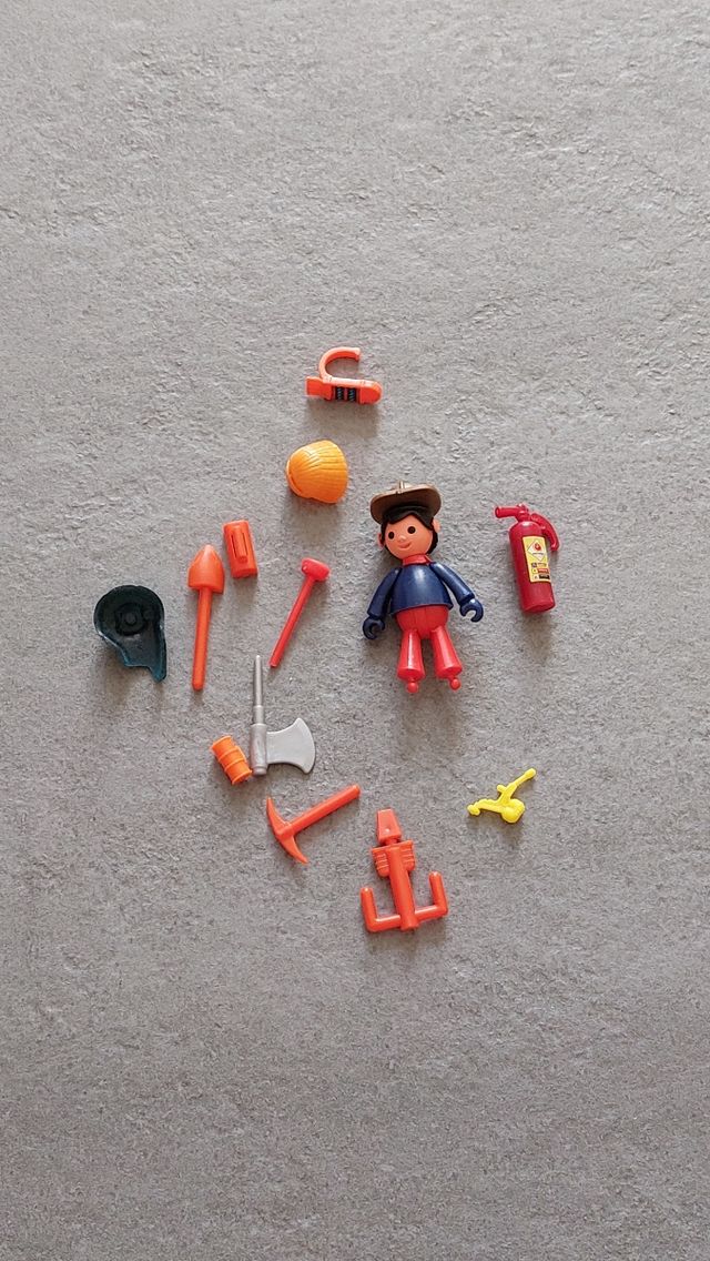 Dettagli del prodottoSet di accessori Playmobil per diverse ambientazioni. Include una figura di bambino, un estintore rosso, un casco, attrezzi come ascia, piccone, martello e pale, oltre ad altri piccoli pezzi.