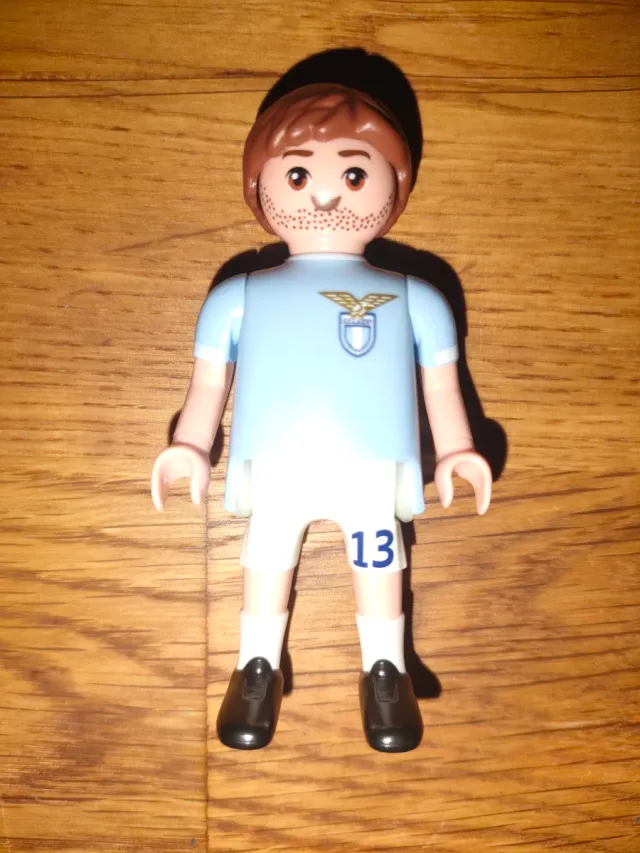 Personaggio Playmobil di un giocatore della Lazio. - Maglia azzurra con stemma. - Numero 13 stampato sui pantaloncini bianchi. - Scarpe nere.