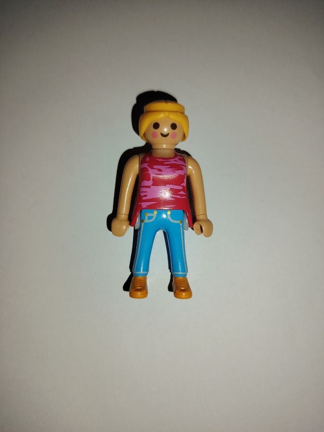 Figura Playmobil in ottime condizioni. - Personaggio femminile con capelli biondi. - Indossa una maglietta rossa e pantaloni blu. - Accessori: nessuno.