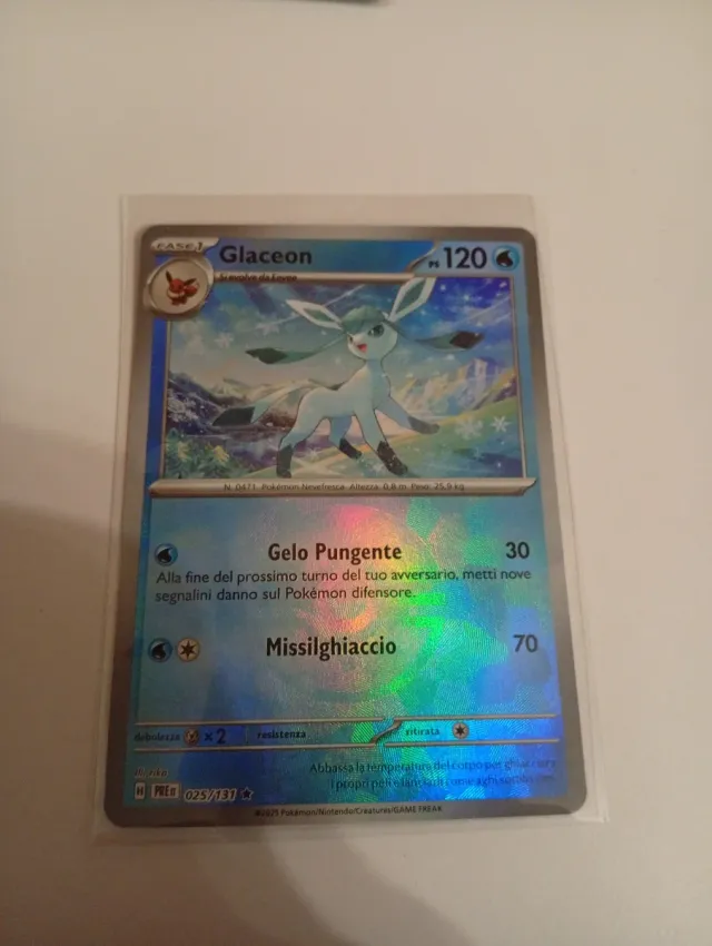 Glaceon - Numero carta: 025/131 - Attacco: Gelo Pungente (30) - Attacco: Missilghiaccio (70) - Debolezza: x2 - Resistenza: - Costo di ritirata: