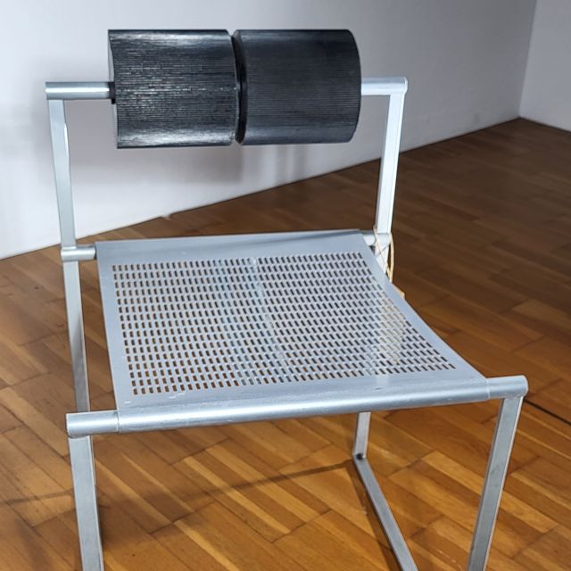 Realizzata con struttura in acciaio e seduta in lamiera d'acciaio forata, mantiene la caratteristica schiena formata da elementi cilindrici in poliuretano nero.