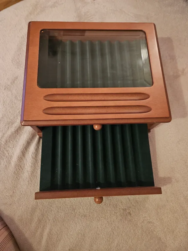 Dettagli del prodottoElegante porta penne stilografiche in legno con coperchio in vetro. Scomparti rivestiti in velluto verde. Cassetto estraibile con maniglie in legno. La descrizione è stata tradotta automaticamente.
