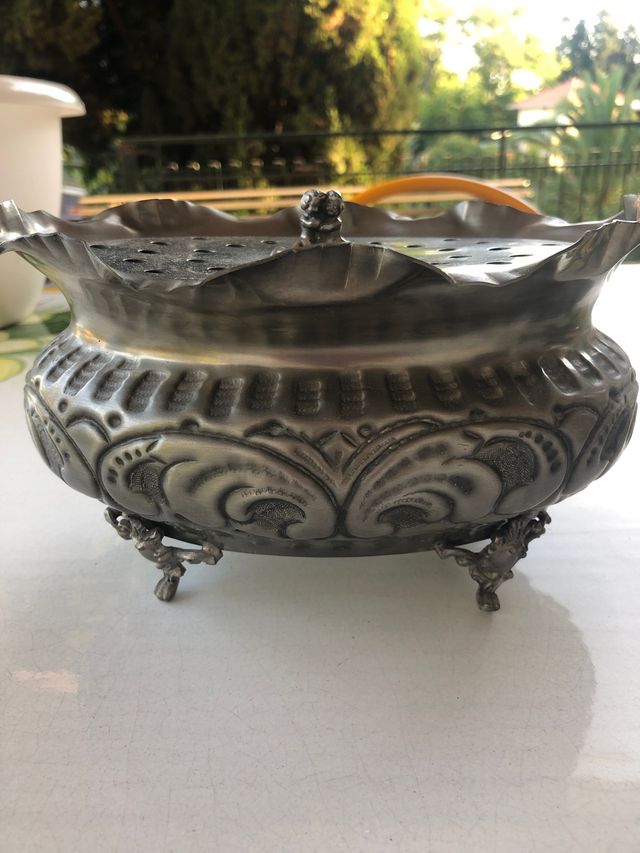 In peltro con 4 piedini lavorati a sbalzo. Due puttini in alto