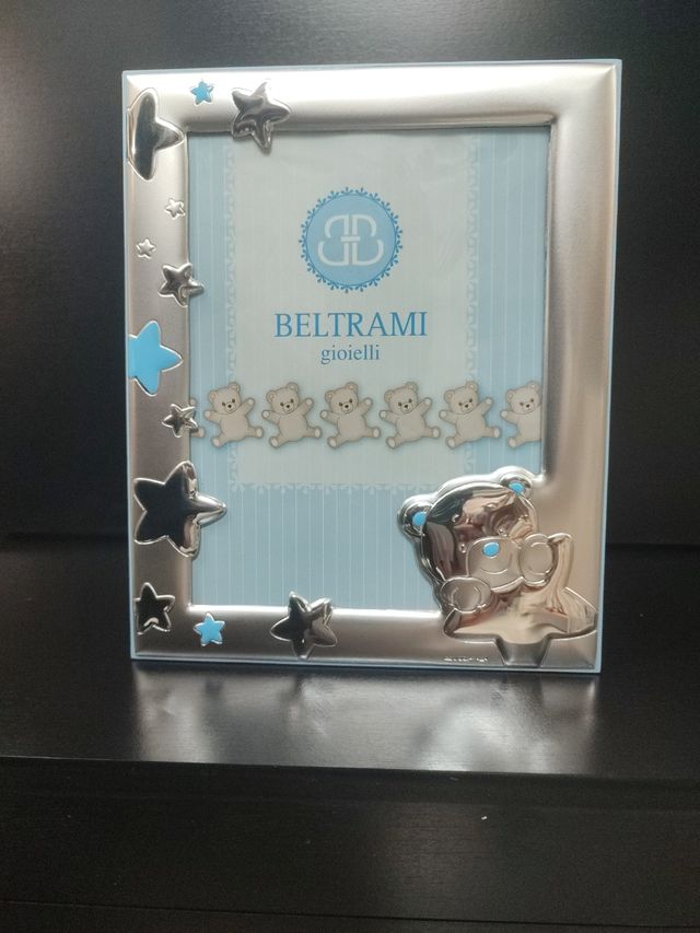 Dettagli del prodottoPorta foto Cornice in argento lucido e satinato con stelle e orsetto struttura in legno colore azzurro per foto dimensioni 15x20cm nuovo senza scatola marchio Beltrami gioielli Misure del prodotto