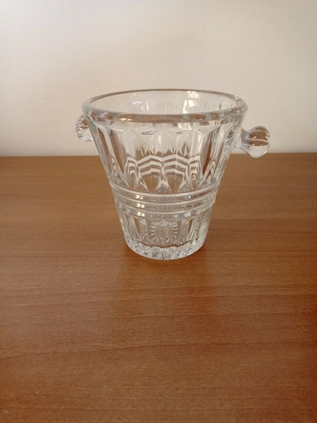 in vetro intarsiato altezza 12 cm, diametro superiore 12 cm , diametro inferiore 7 cm. si potrebbe usare anche come vaso per fiori.