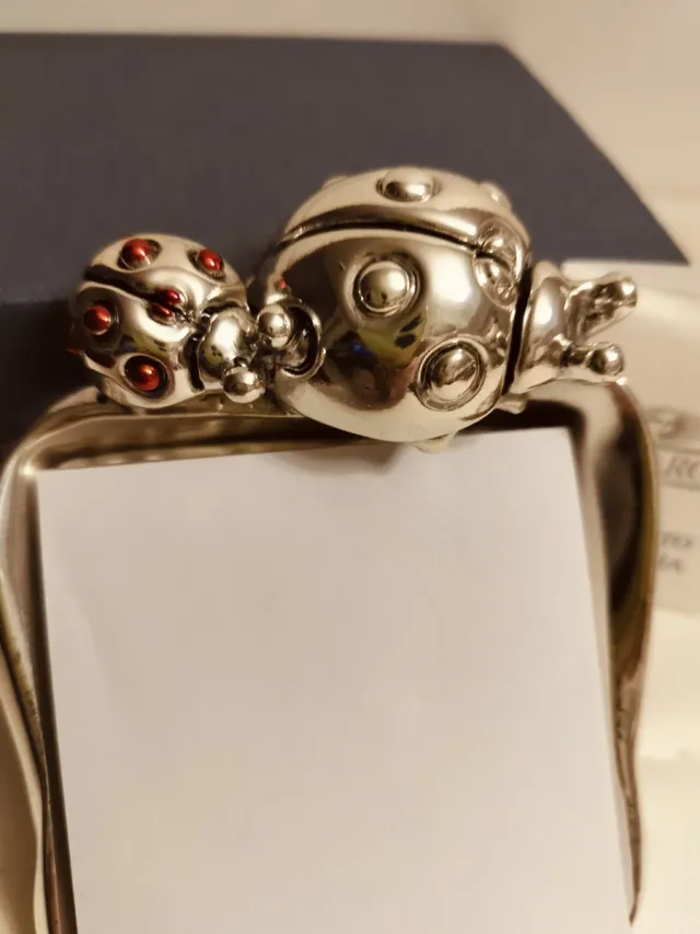 Dettagli del prodottoGrazioso porta post-it in argento, modellato a forma di coccinella con dettagli rossi.