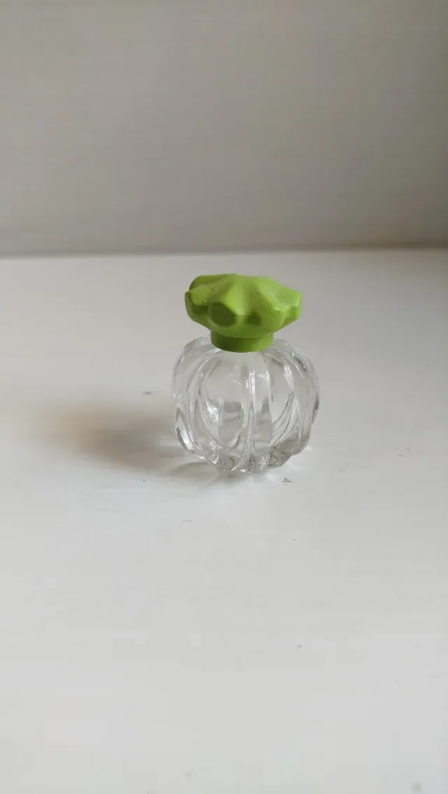 Elegante porta profumo vintage in vetro trasparente con tappo verde. - Design ricercato con finitura a coste. - Tappo decorativo a forma di fiore.