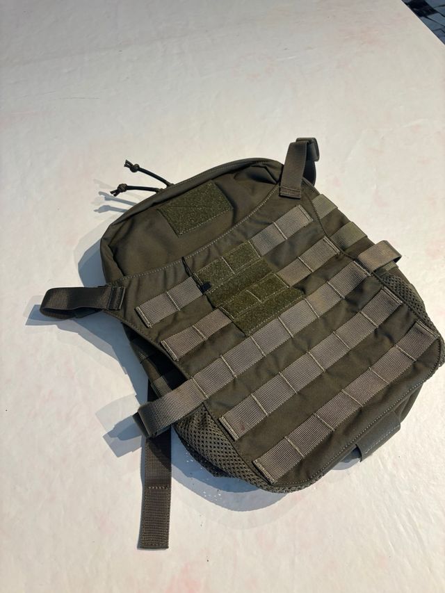 Porta sacca idratazione e porta elmetto in tessuto resistente. - Design modulare con sistema MOLLE. - Patch in velcro. - Cinghie regolabili.