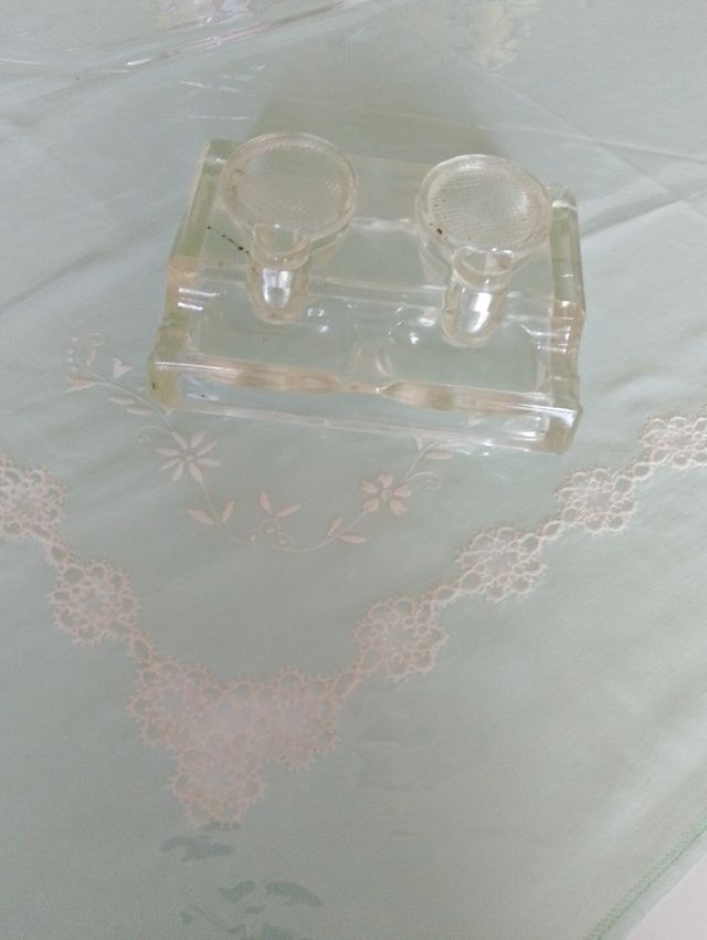 Dettagli del prodottoÈ un oggetto da scrivania vintage in vetro pesante.Ha due scomparti dove poter mettere gomma o altro e il porta penna.presenta alcuni filamenti ed è un po' scalfito. Misure del prodotto