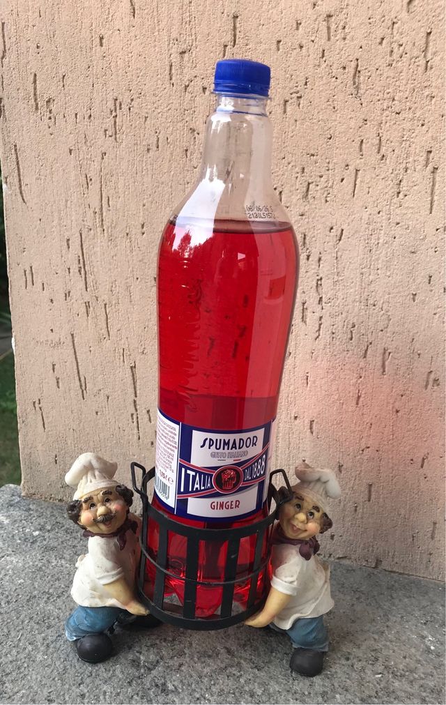 Dettagli del prodottoOriginale vendo simpatico portabottiglie a forma di carretto, sorretto da due simpatici chef.