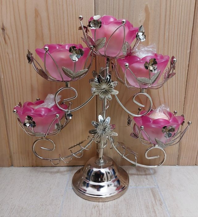 vendo portacandele metallo cromato con portacandele di vetro rosa diametro 28cm.