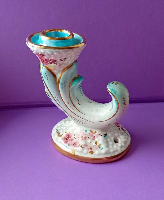 Cornucopia porta candela molto originale. Lavorazione accurata: bolle in rilievo,fiorellini dipinti,bordino oro e smalto turchese acceso.La firma in oro sul fondo oltre alla garanzia di autenticità sottolinea la qualità dell'oggetto.