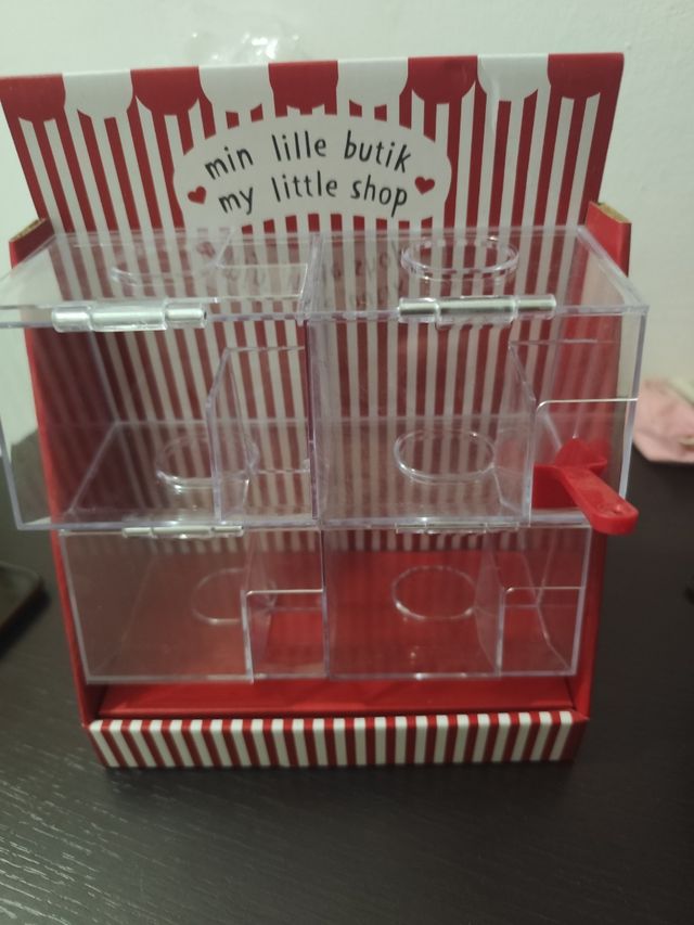 Dettagli del prodottoPortacaramelle trasparente con un design a strisce rosse e bianche, perfetto per dispensare caramelle o piccoli oggetti.