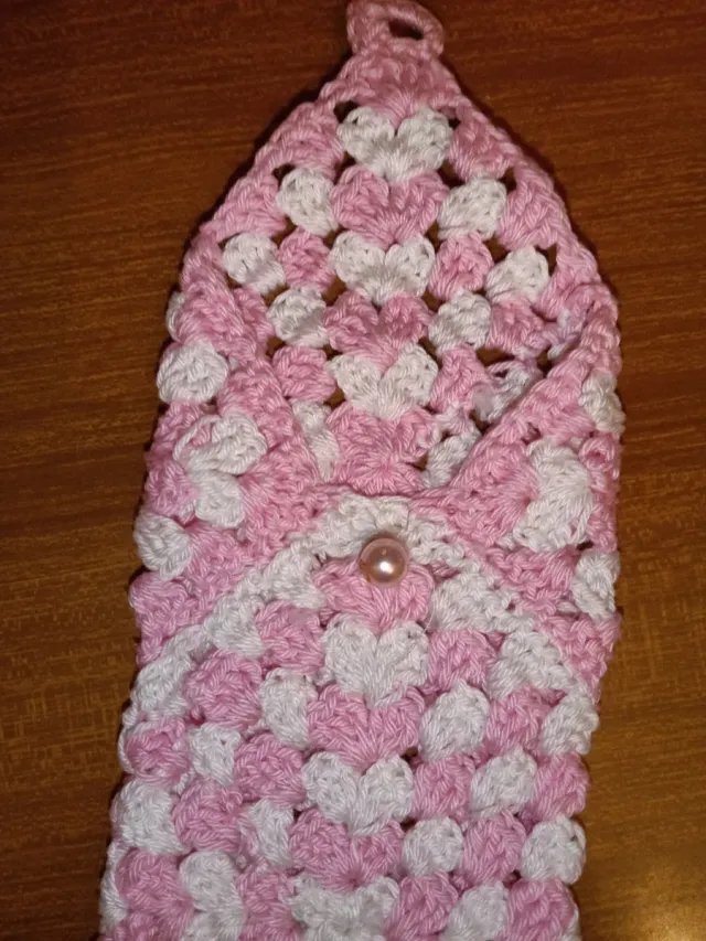 Dettagli del prodottoPortacellulare realizzato all'uncinetto con filato rosa e bianco, decorato con una perla.
