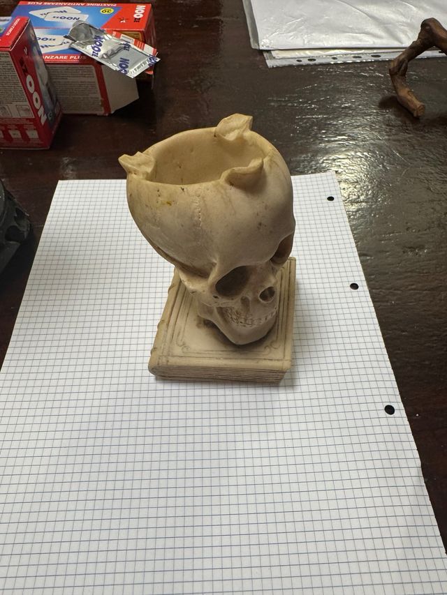 Originale portacenere a forma di teschio poggiato su una pila di libri. - Design unico e decorativo. - Materiale: resina. - Colore: beige.