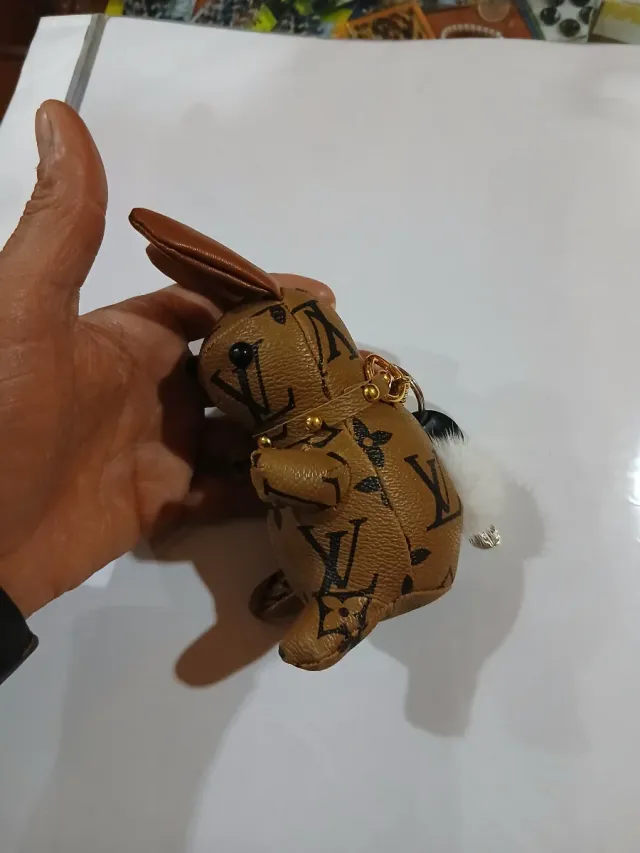 Portachiavi a forma di coniglietto con fantasia - Materiale: ecopelle - Dettagli: fantasia monogram, orecchie marroni, pompon bianco