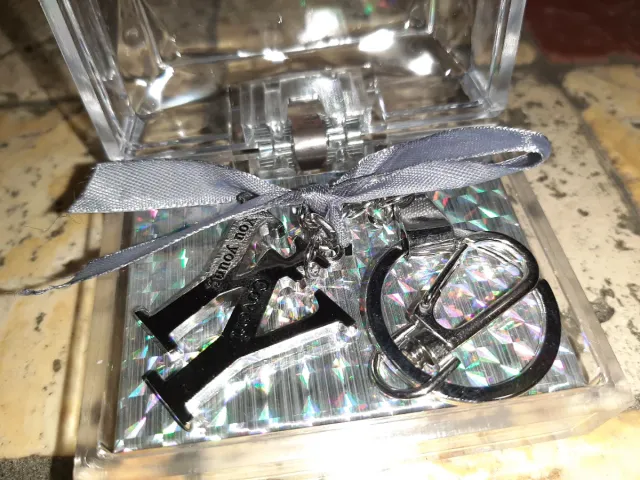 Dettagli del prodottoPortachiavi con ciondoli a forma di lettere e un moschettone.