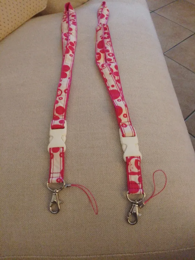 Portachiavi da collo con un simpatico motivo a pois e cuori. - Due pezzi inclusi. - Chiusura a moschettone. - Fibbia in plastica bianca.