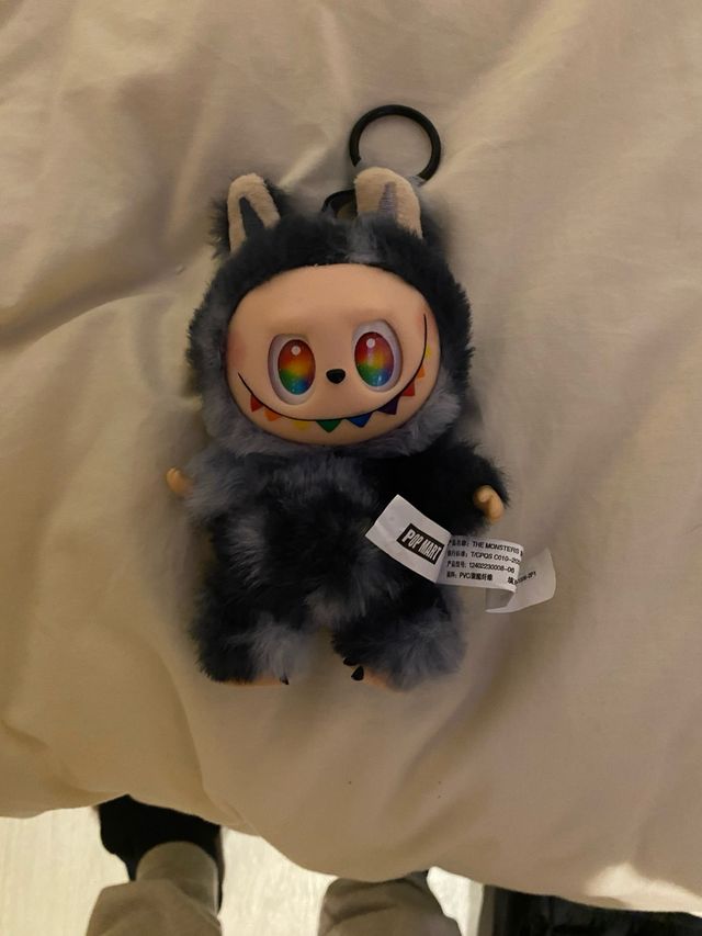 Portachiavi a forma di Labubu, un personaggio con un design unico. - Materiale morbido e peloso. - Dettagli colorati sul viso. - Etichetta POP MART visibile.