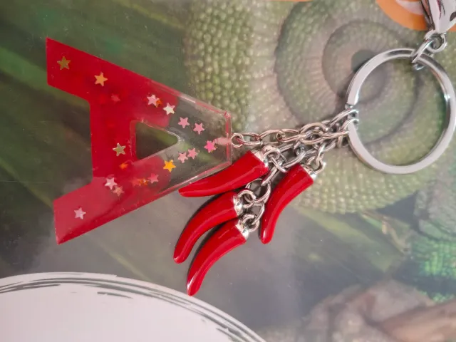Dettagli del prodottoPortachiavi personalizzato con la lettera A, decorato con glitter a forma di stelle e ciondoli a forma di peperoncino rosso.