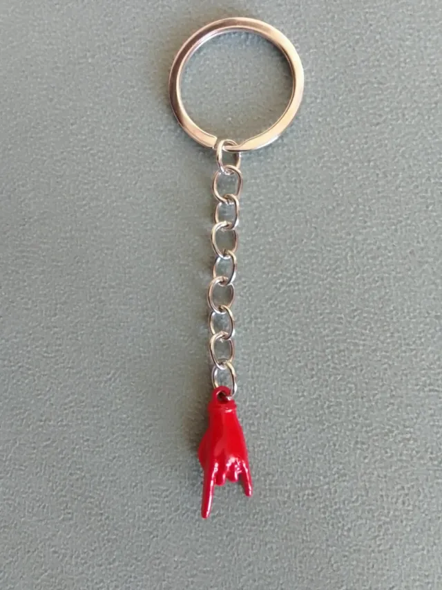Portachiavi con ciondolo a forma di mano che fa il segno rock o corna. - Ciondolo di colore rosso. - Catena metallica. - Anello portachiavi.