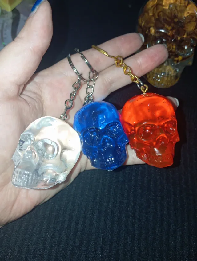 Dettagli del prodottoSet di tre portachiavi a forma di teschio in resina colorata.