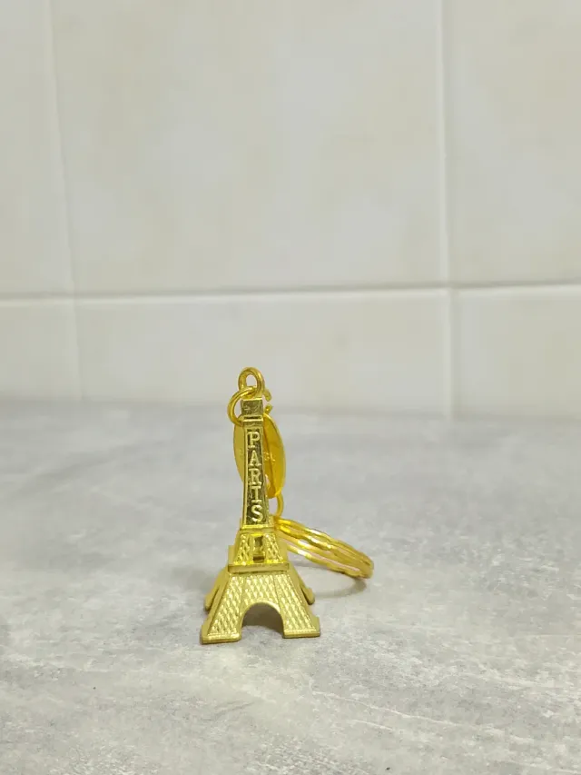 Portachiavi a forma di Torre Eiffel, un souvenir iconico di Parigi. - Design dorato. - Dettaglio della scritta PARIS sulla torre. - Completo di anello per chiavi.