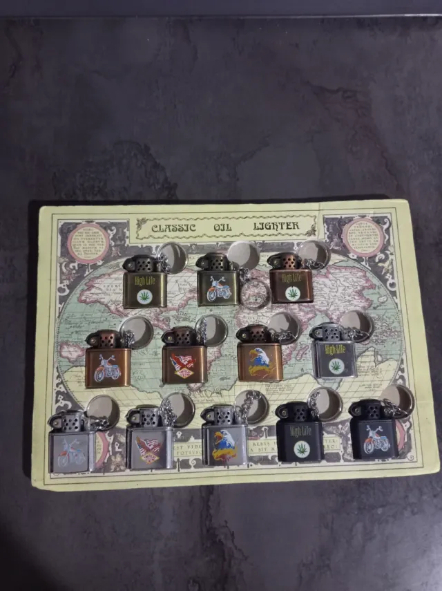 Dettagli del prodottoSet di accendini vintage con portachiavi, perfetti per collezionisti.