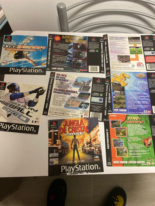 Dettagli del prodottoSet di copertine e retrocopertine per giochi PlayStation 1. Include copertine per: CoolBoarders 4, Resident Evil Director's Cut, FIFA - Rumbo al Mundial 98, Triple Play Baseball 2000, Jungla de Cristal: Trilogía 2, Dino-Viertetey (La Dinocabalgada). Materiale stampato per scatole di giochi. PAL Spagna!!!ciascuna ha il suo prezzo La descrizione è stata tradotta automaticamente.
