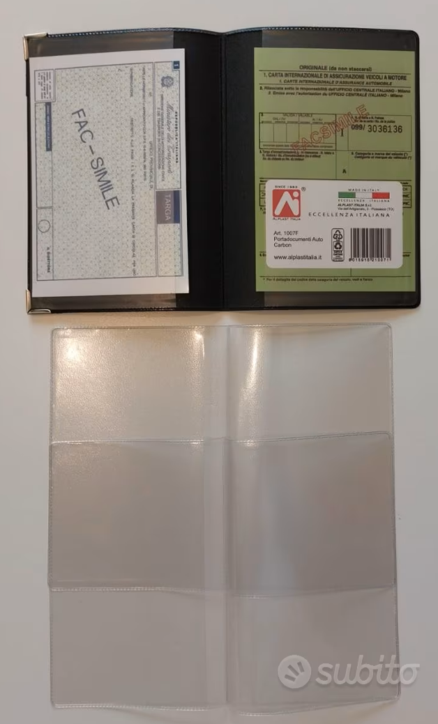 Dettagli del prodottoPortadocumenti per auto e moto, con chiusura a due ante. È in ottime condizioni ed è perfetto per riporre in modo ordinato i documenti del veicolo.