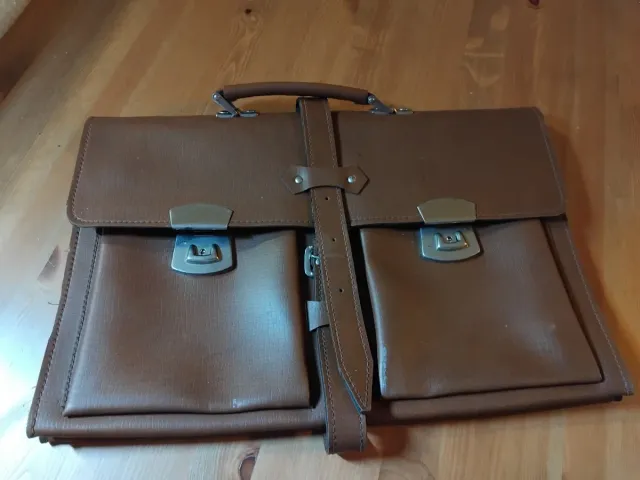 Dettagli del prodottoElegante portadocumenti in stile vintage, risalente agli anni '60 o '70. Realizzato in similpelle marrone, presenta un design classico con chiusure metalliche e doppio scomparto, dimensioni 40x30 cm, da sistemare.