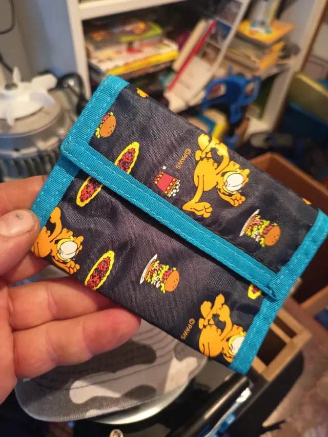 Portafoglio con fantasia di Garfield e cibo. Perfetto per gli amanti del personaggio. - Fantasia con Garfield e cibi. - Bordi azzurri. - Chiusura a strappo.